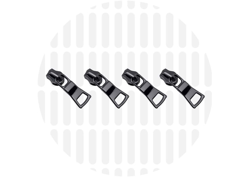 Vier stevige schuivers voor smalle spiraalrits #S3 met een grote uitsparing, ideaal om een musketonhaak aan te bevestigen.